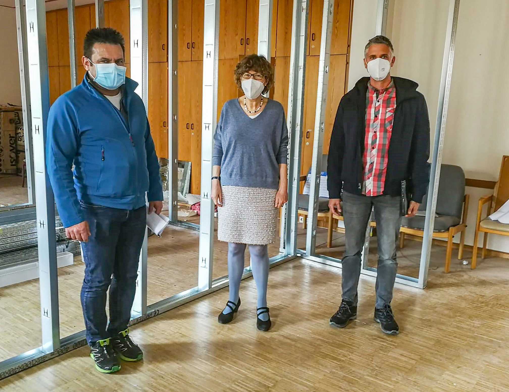 Erste Stellwände für provisorische Büros der Verwaltung sind gestellt.