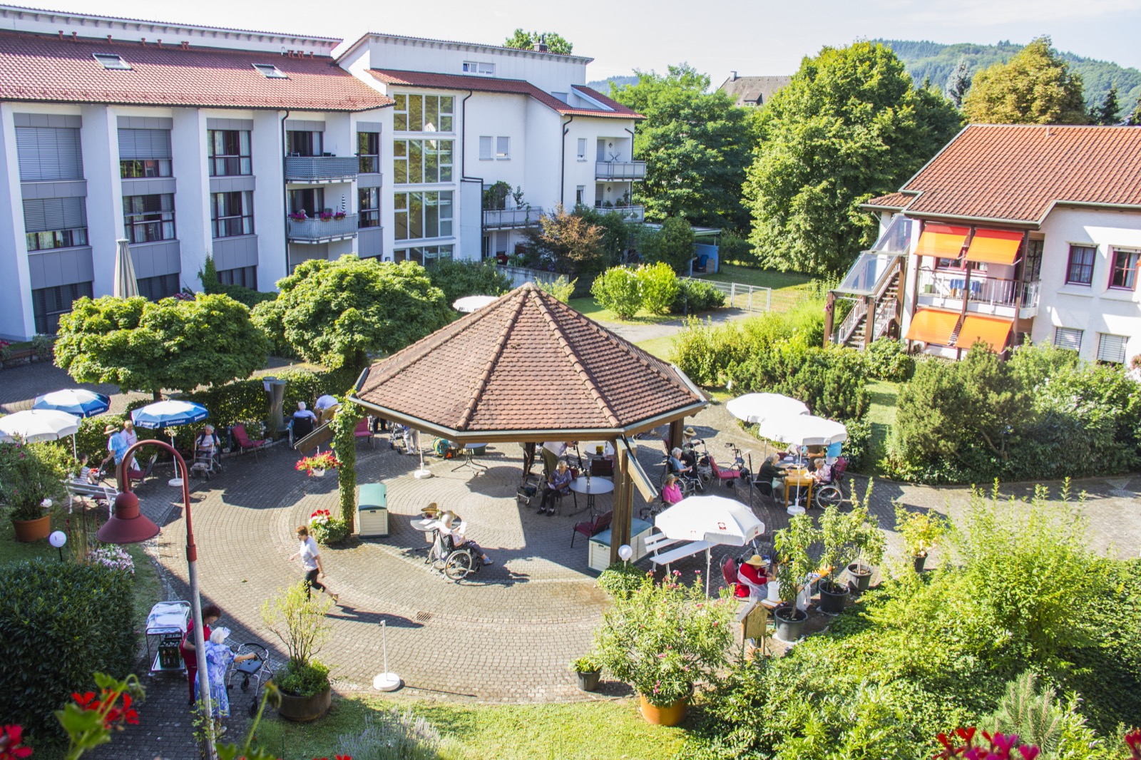 Nach der Eröffnung 1987 wurde das Haus 2001 und 2008 um jeweils einen Flügel erweitert, die sich um einen sonnigen Innengarten gruppieren. Von 2021 bis 2024 fanden umfangreiche Umbaumaßnahmen statt, so dass unsere Einrichtung nun insgesamt über 79 Einzelzimmer verfügt, die alle mit Bad und teilweise auch mit Balkon ausgestattet sind und gerne auch individuell eingerichtet werden können. Mit dem Umbau nehmen wir einen Schritt in die Zukunft, indem wir uns vom „institutionellen“ Charakter gelöst haben. Unsere Hausstruktur wurde nach dem Hausgemeinschaftskonzept umgestaltet. Das bedeutet kleinere Einheiten mit maximal 15 Bewohnerinnen und Bewohnern, in denen täglich das Essen von unseren Alltagsbegleiterinnen – gerne mithilfe der in der Einrichtung lebenden Menschen – zubereitet wird.